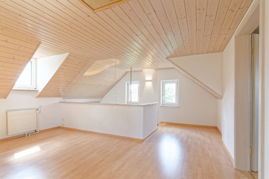 Über eine Treppe gelangen Sie ins zweite Obergeschoss. Hier liegen drei helle Schlafzimmer. Ein grosser Vorraum eignet sich ideal als Spielplatz für die Kinder, kann aber auch sehr gut als Büro oder Arbeitsraum genutzt werden. Über eine Ausziehtreppe ist ein praktischer Estrich erreichbar, der viel Stauraum bietet.