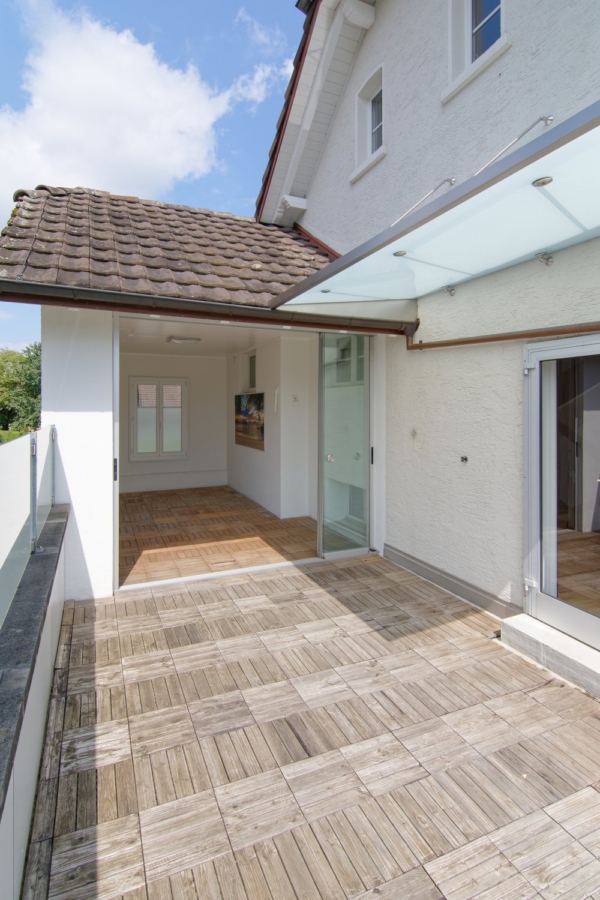 Eine Halbetage höher befinden sich ein Gäste-WC sowie der Zugang zu einer grossen Terrasse mit Blick auf den Garten. Diese ist grösstenteils gedeckt und zur Hälfte verglast, so dass sie auch bei schlechterem Wetter genutzt werden kann.