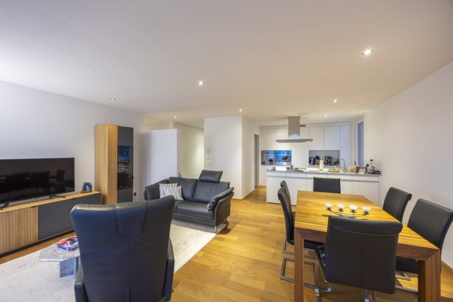 Das Herzstück der Wohnung bildet ein grosszügiger, offen gestalteter Wohn-Essbereich mit offener Küche und Zugang zum Balkon. Grosse Fensterflächen und heller Parkettboden schaffen ein freundliches, stilvolles Ambiente. Die Küche überzeugt mit einer Kochinsel, viel Stauraum und modernen Geräten. Besonders praktisch. Angrenzend zur Küche befindet sich ein Reduit mit viel Platz für Vorräte oder Putzutensilien. Der grosse, gedeckte Balkon ist von sämtlichen Zimmern der Wohnung direkt begehbar und wird in den warmen Monaten des Jahres zu einer natürlichen Erweiterung des Wohnraums. Hier geniessen Sie gesellige Stunden mit Familie und Freuden und finden die nötige Entspannung nach einem erlebnisreichen Tag.