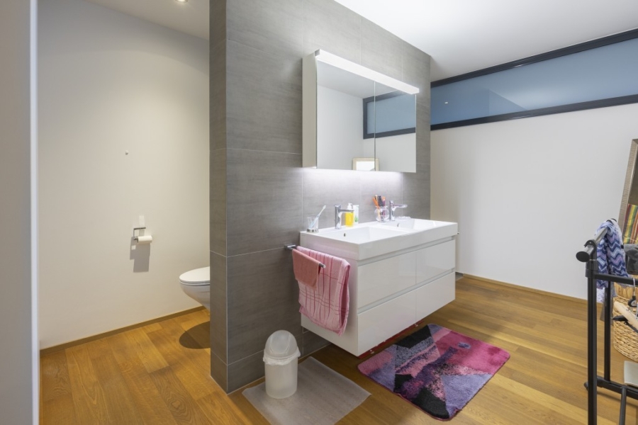 Die Schlafzimmer und Bäder liegen im hinteren Teil der Wohnung und sind vom Flur aus zugänglich. Das geräumige Elternschlafzimmer präsentiert sich mit einem eigenen Ensuite-Badezimmer, das mit WC, Lavabo und Dusche ausgestattet ist. Das zweite Schlafzimmer – ebenfalls mit Zugang zum Balkon – kann vielseitig als Kinder-, Gästezimmer oder auch Büro genutzt werden. In beiden Schlafzimmern sorgen Parkettböden für ein freundliches Wohngefühl. Das zweite Badezimmer ist vom Flur aus zugänglich. Es verfügt über WC, Lavabo und Badewanne, ausserdem ist hier ein Waschturm mit Waschmaschine und Tumbler untergebracht, so dass Sie die Wäsche bequem in der Wohnung erledigen können.