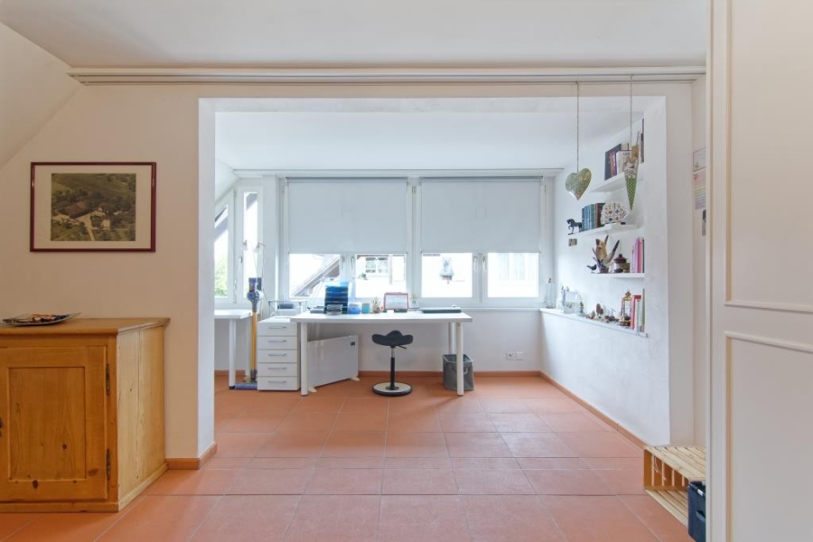 Die modern ausgestattete Küche fügt sich harmonisch ins Wohnkonzept ein und bietet viel Stauraum und Komfort. Auf den beiden Ebenen befinden sich drei weitere Zimmer, welche flexibel als Schlafzimmer, Büro oder Hobbyräume genutzt werden können. Ein Badezimmer mit Badewanne sowie ein separates WC ergänzen den praktischen Grundriss.